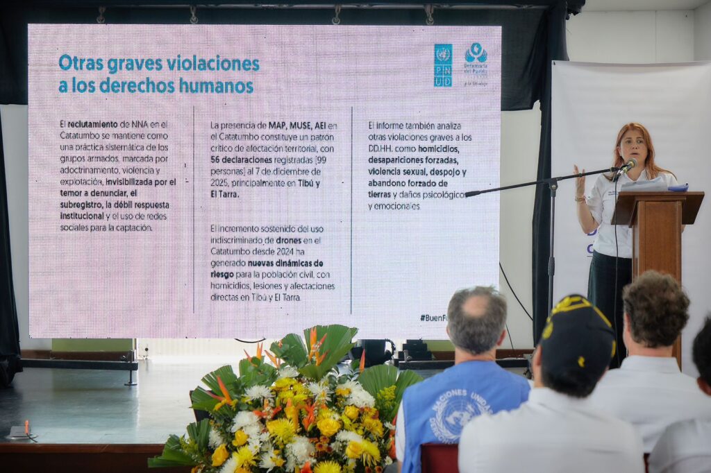 Tibú (Norte de Santander), 16 de enero de 2026 (@DefensoriaCol). La Defensoría del Pueblo presentó en Tibú, Norte de Santander, dos informes sobre la situación de derechos humanos en la subregión Catatumbo, los cuales dan cuenta de que, un año después del desplazamiento masivo registrado a causa de la agudización del conflicto armado, la población civil continúa enfrentando graves afectaciones derivadas del control territorial de actores armados ilegales, el reclutamiento de niñas, niños y adolescentes (NNA) y diversas formas de violencia.