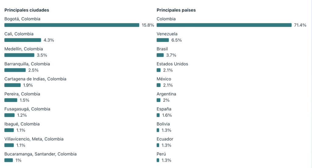 Durante mayo y julio, el sitio web experimentó un crecimiento moderado en visitantes únicos (de 273 a 311) y un aumento significativo en impresiones, alcanzando 30.000 en julio. Aunque el tiempo promedio de permanencia disminuyó ligeramente respecto a mayo (de 2:24 a 2:14 minutos), se mantuvo por encima de junio. El tráfico directo se fortaleció (47,1 % en julio), mientras que el social orgánico disminuyó (21,6 %), lo que sugiere que más usuarios están accediendo directamente al sitio, posiblemente por posicionamiento de marca. Las visitas desde smartphones siguen siendo mayoría (60,2 %), aunque con una leve tendencia a equilibrarse con el uso de computadoras. A nivel geográfico, Colombia sigue siendo el país con mayor número de espectadores, pero Estados Unidos creció del 20,6 % en mayo al 22,1 % en julio, lo que puede representar una oportunidad para expandir el alcance internacional del sitio.