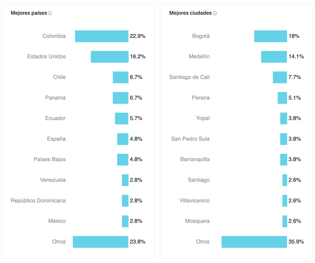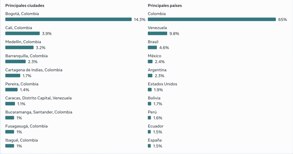 | 30.3% Colombia 8.2% Estados Unidos 7.0% México 4.0% Venezuela 3.1% Peru 1.7% Chile 1.5% Ecuador 1.2% España 1.0% Nicaragua 0.5% Argentina 0.5% Rep. Domin. | 21.4% Colombia 12.8% Estados Unidos 12.6% México 5.5% Venezuela 2% España 1.9% Chile 1.6% Nicaragua 1.6% El Salvador 1.1% Perú 0.7% Cuba 0.5% Brasil | 40.3% Colombia 6.7% México 5.7% Estados Unidos 12.6% México 3.9% Venezuela 0.9% Perú 0.6% España 0.6% Ecuador 0.6% Brasil 0.5% Nicaragua 0.5% Chile |